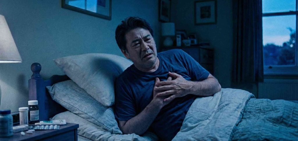 - 就寝中、酸っぱいものが上がってきて咳き込んで起きる